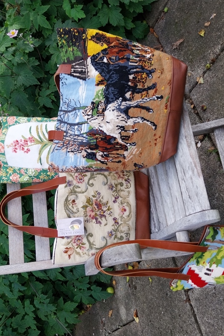 Jeg syr også tasker af genbrugsmaterialer, hvor jeg fx anvender gamle broderier og andet håndværk.